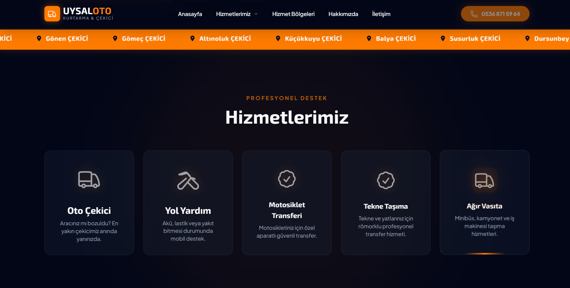 Uysal Oto Kurtarma projesi, Balıkesir ve çevresinde hizmet veren bir yol yardım firması için geliştirdiğim, yüksek performans ve kullanıcı deneyimi (UX) odaklı kurumsal bir web çözümüdür. Projenin temel amacı, yolda kalan kullanıcıların en hızlı şekilde firmaya ulaşmasını sağlamak ve Google aramalarında (SEO) üst sıralarda yer almaktır.